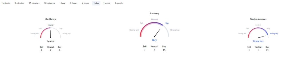 At present, Bitcoin is trading at $34,095, with a daily loss of approximately 0.15%. However, the weekly chart indicates a surge of over 14%. Technical analysis leans towards bullish sentiments, with various indicators favoring a ‘buy’ rating.