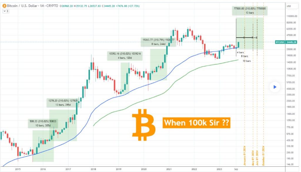The analysis suggests that Bitcoin could embark on a significant 310% rally, potentially propelling it to $100,000, in one of four potential months in 2024. These months include January, May, July, or October 2024.